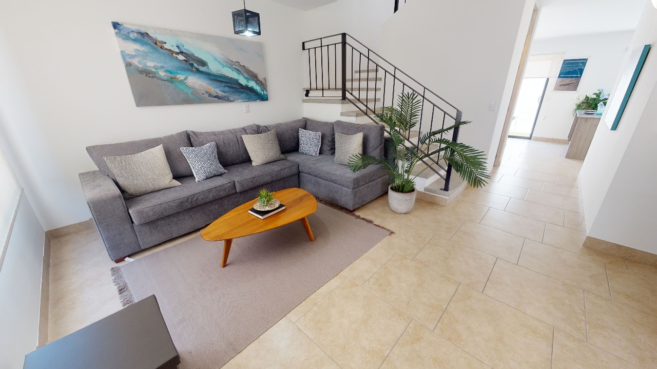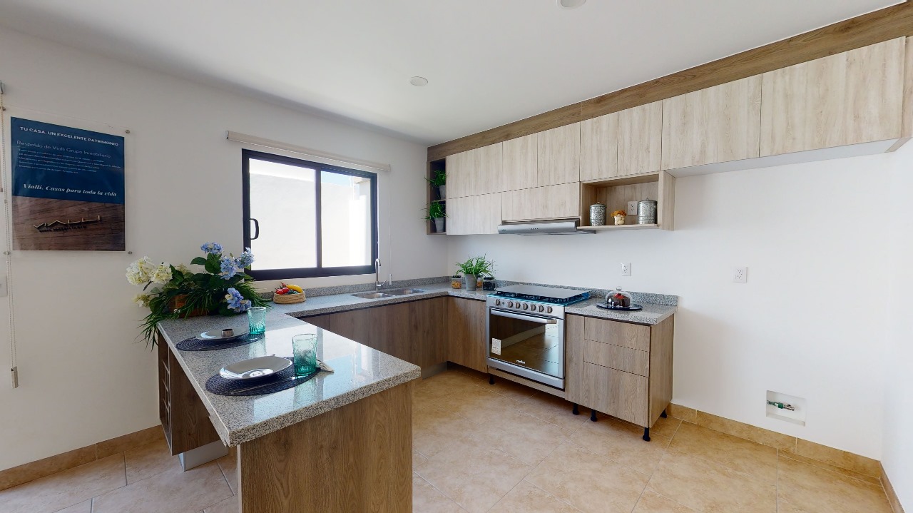 Casa por estrenar en condominio en El Refugio. Tiene cochera para dos autos y jardín. En PB está la sala, el comedor y la cocina integral con granito, baño para visitas, bodega y amplia área de lavado. En PA están tres recámaras, la principal con vestidor y baño, y dos recámaras secundarias que comparten un baño completo.