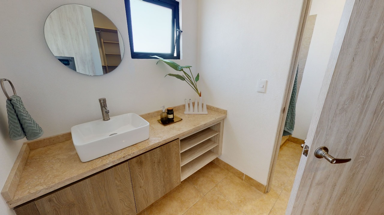 Casa por estrenar en condominio en El Refugio. Tiene cochera para dos autos y jardín. En PB está la sala, el comedor y la cocina integral con granito, baño para visitas, bodega y amplia área de lavado. En PA están tres recámaras, la principal con vestidor y baño, y dos recámaras secundarias que comparten un baño completo.