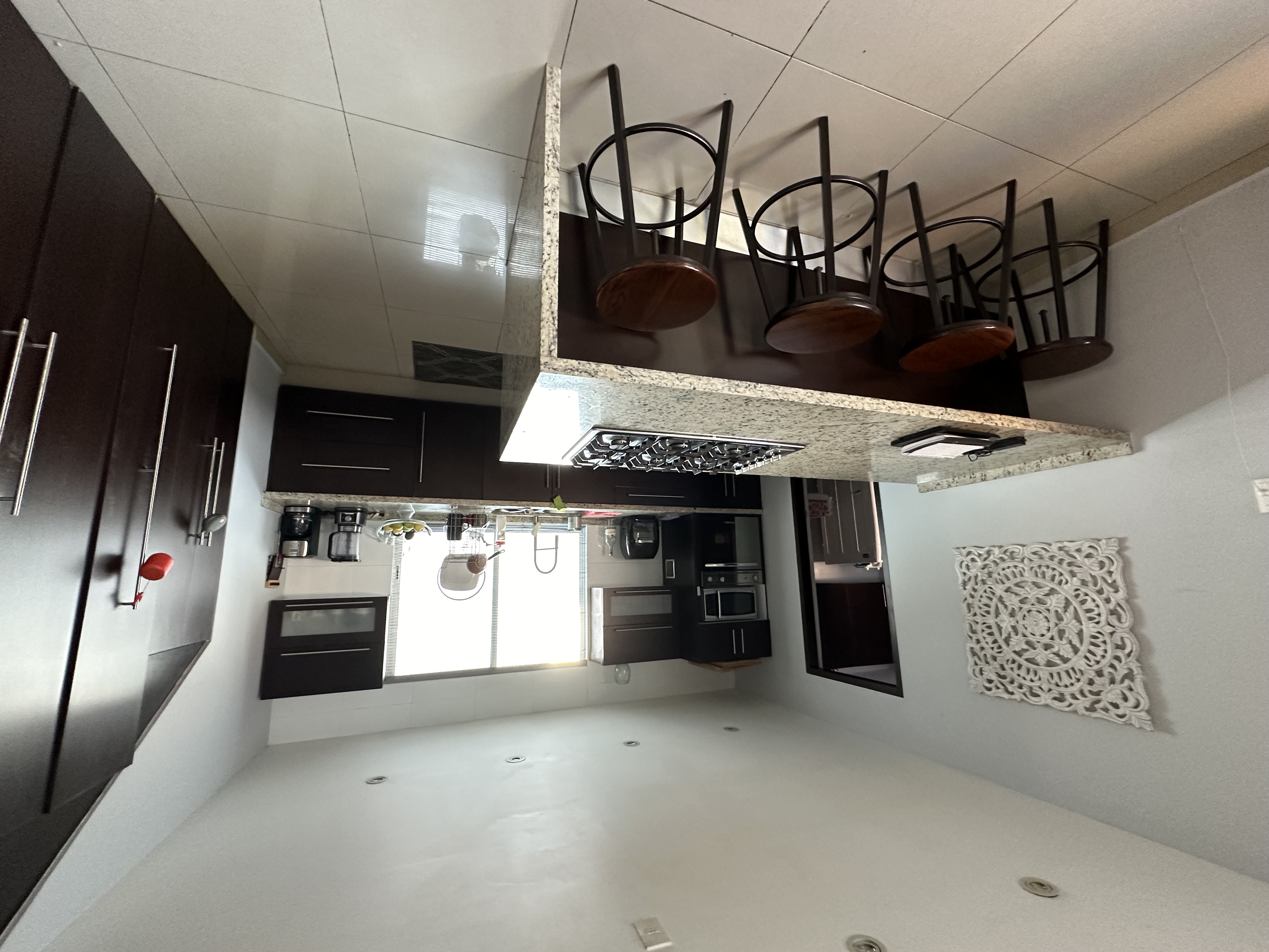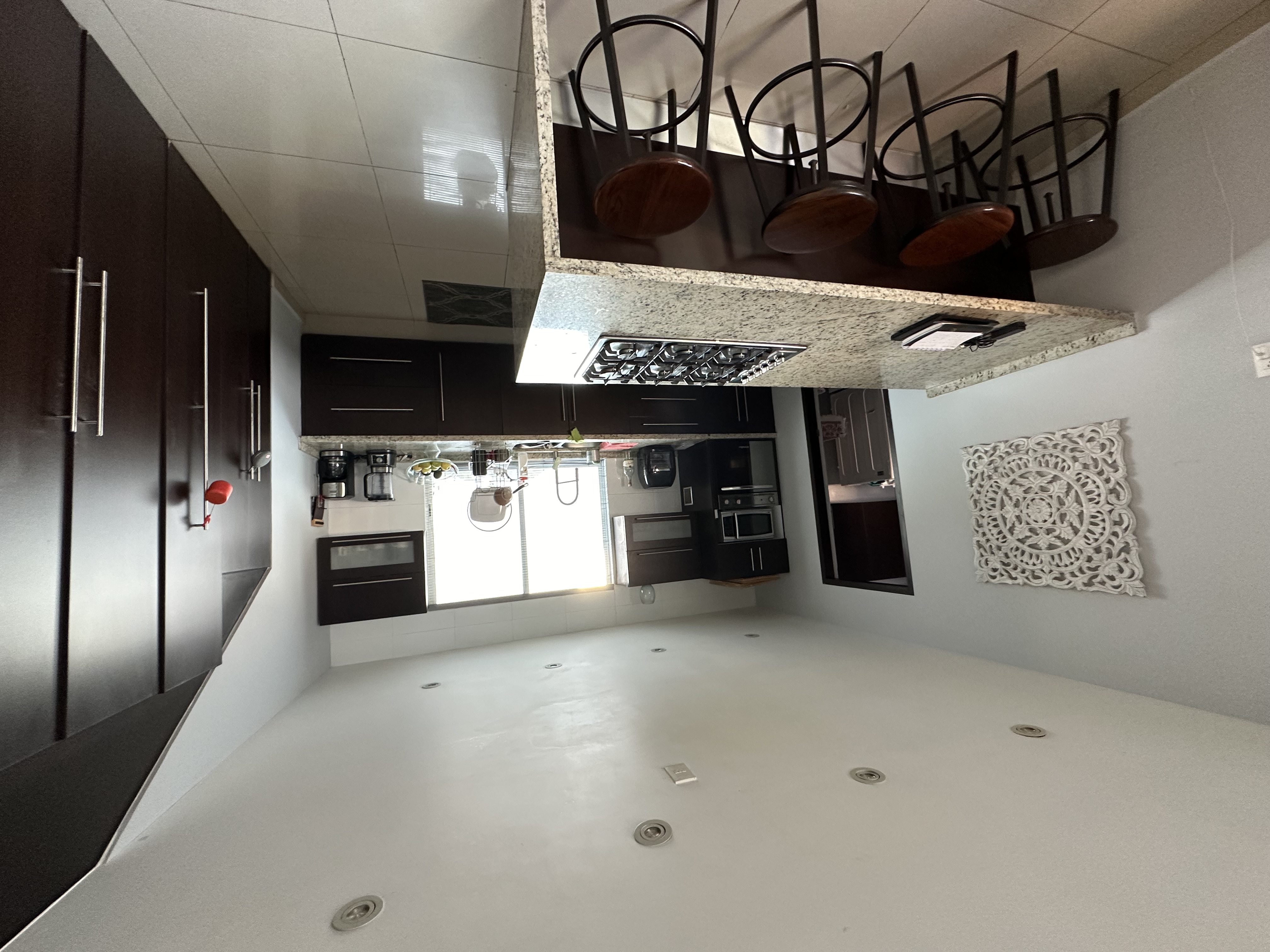 cocina equipada camplia barra desayunadora recubierta de granito
